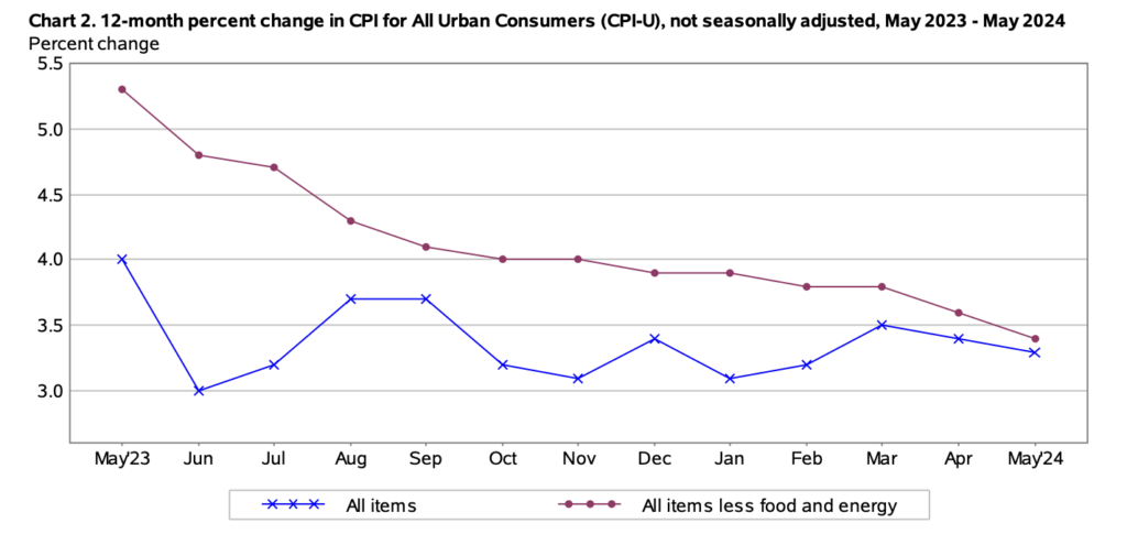 五月份消費者物價指數CPI,年增3.3%,核心CPI年增3.4%是2021年4月以來最低,幾乎回到通膨剛開始的位置,雙雙低於市場預期,這是今年第一次CPI 低於市場預期,公布當時讓黃金、道瓊都瞬間拉升。